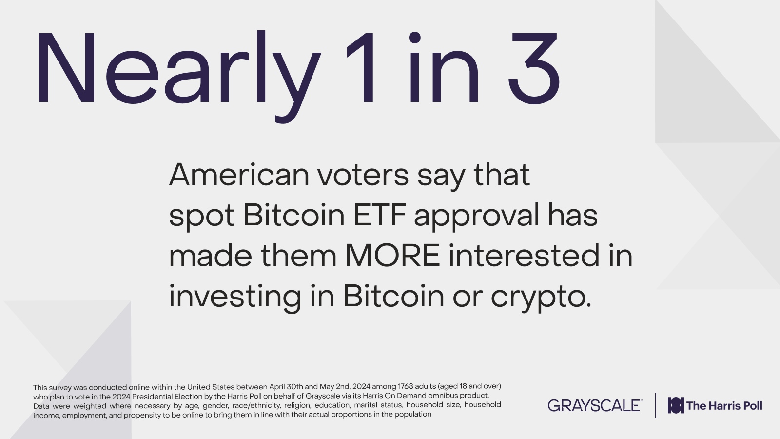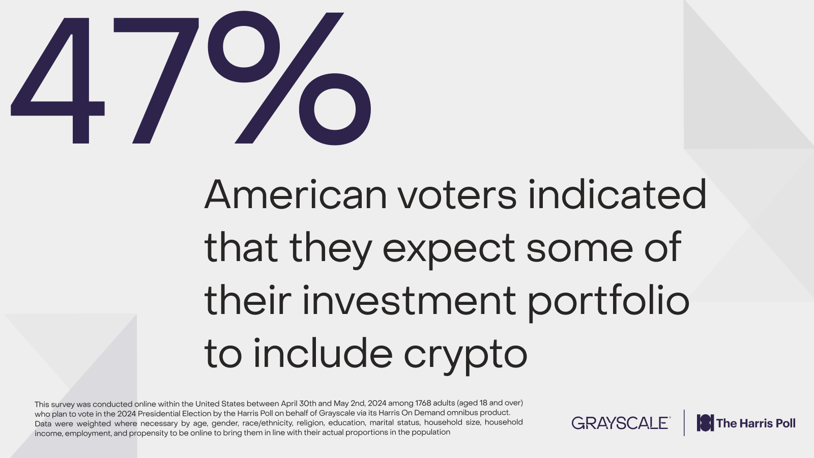 The source is a survey conducted by Harris Poll on behalf of Grayscale regarding voters in the 2024 US Election : 2024 Election: The Role of Crypto.